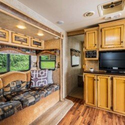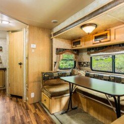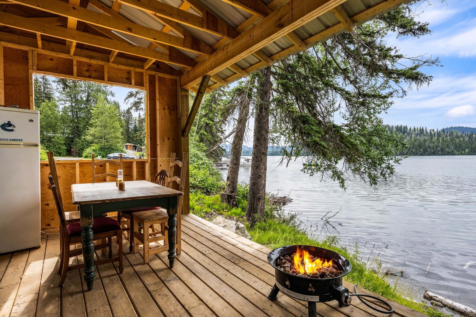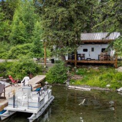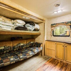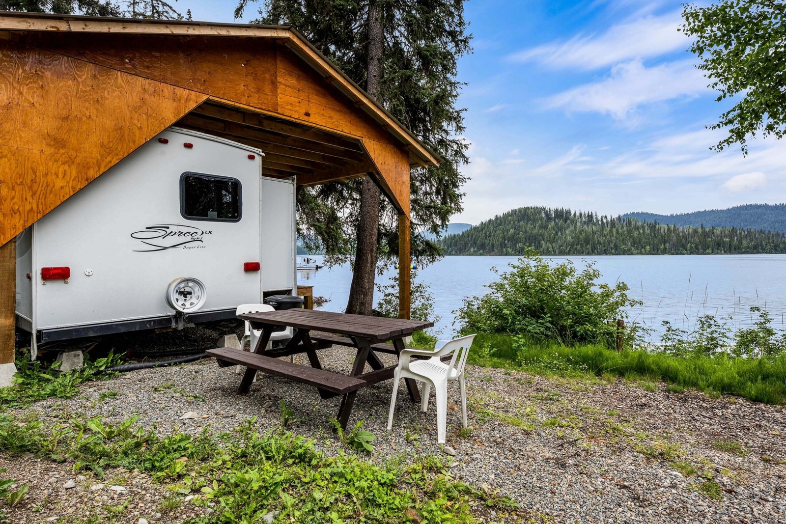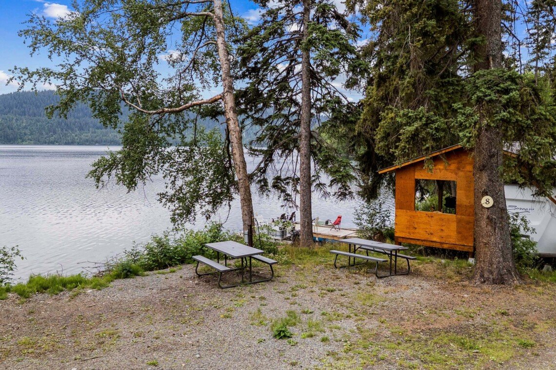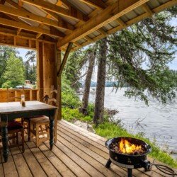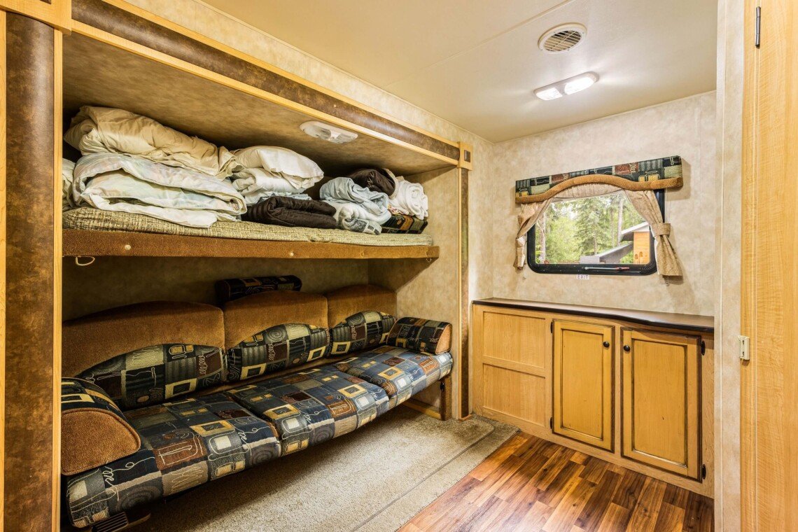A rare find! Gorgeous RV snuggled up to the lake’s edge. Huge covered deck with barbeque, table & chairs. It has a queen in the master bedroom, bunk beds and a double pull-out bed. Boasts a large kitchen area with nook seating around the table. Two super slides create spacious comfort. Kayaks can be parked at the water’s edge just meters from your front door. Watch the kids fish from your deck and even stroll out and have yourself a much deserved refreshing dip. Bring your own bedding, pillow, & towels.